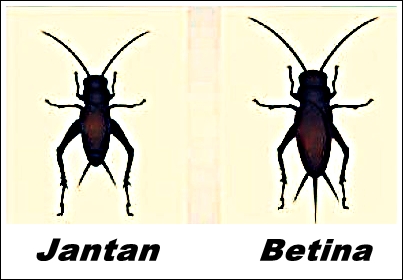 10. Apa perbedaan jangkrik jantan dan betina? Untuk membedakan jangkrik jantan dan betina, cukuplah mudah, jangkrik jantan tidak memiliki jarum di bagian belakang tubuhnya, sedangkan untuk jangkrik betina memiliki jarum di bagian belakang tubuhnya, serta bagian sayap luarnya lebih halus di bandingkan dengan sayap luar jangkrik jantan yang cukup kasar.